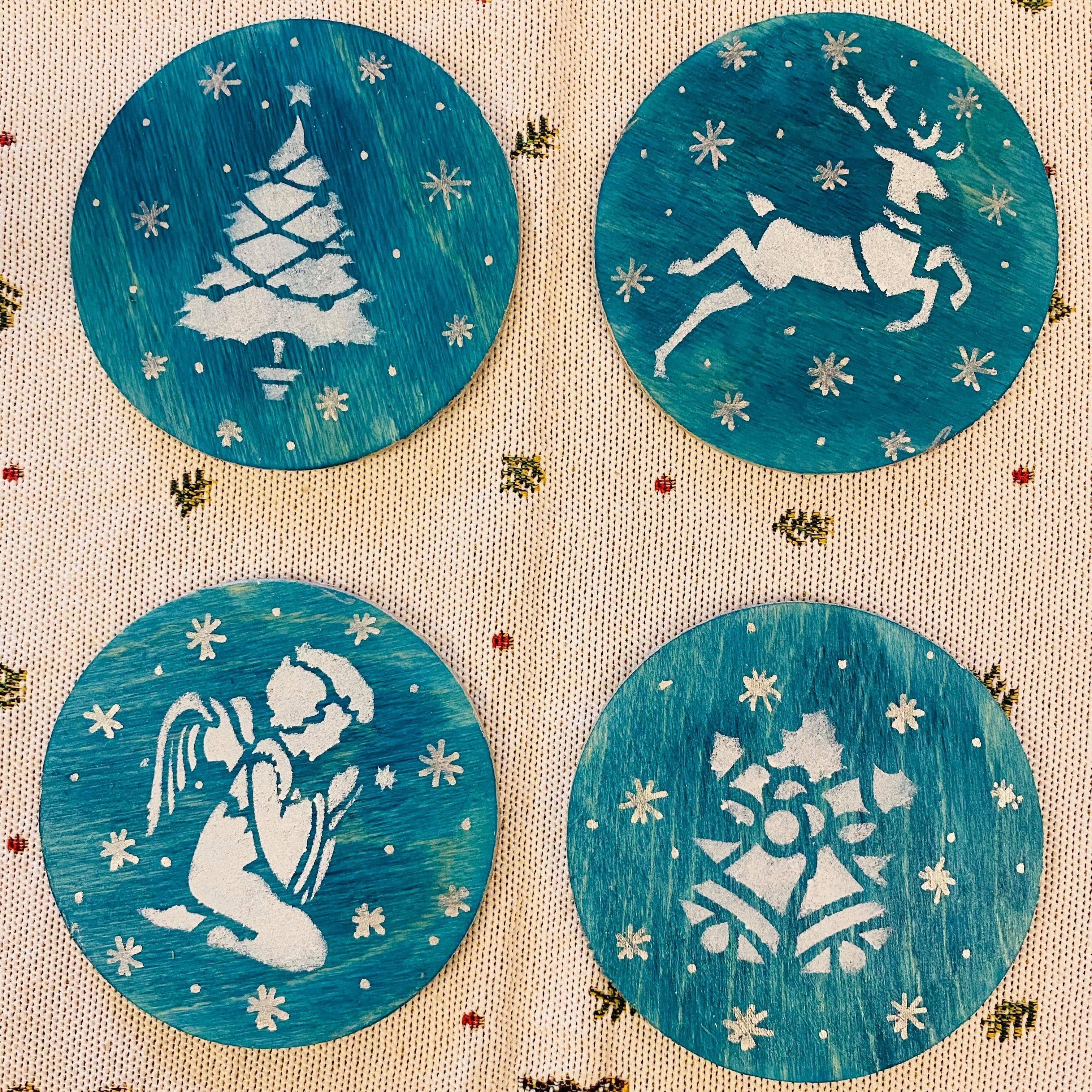 - Place your chosen Christmas stencil (e.g., Angel, Christmas tree, bell, reindeer) on the coaster and secure it with masking tape.
