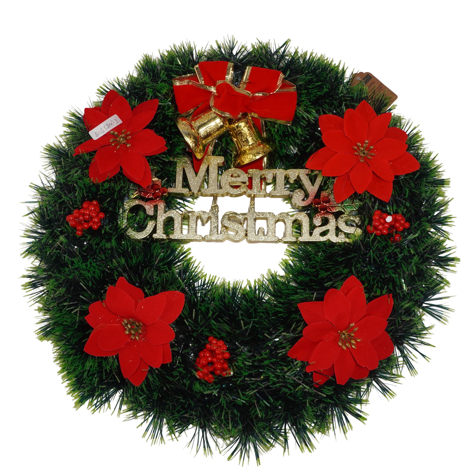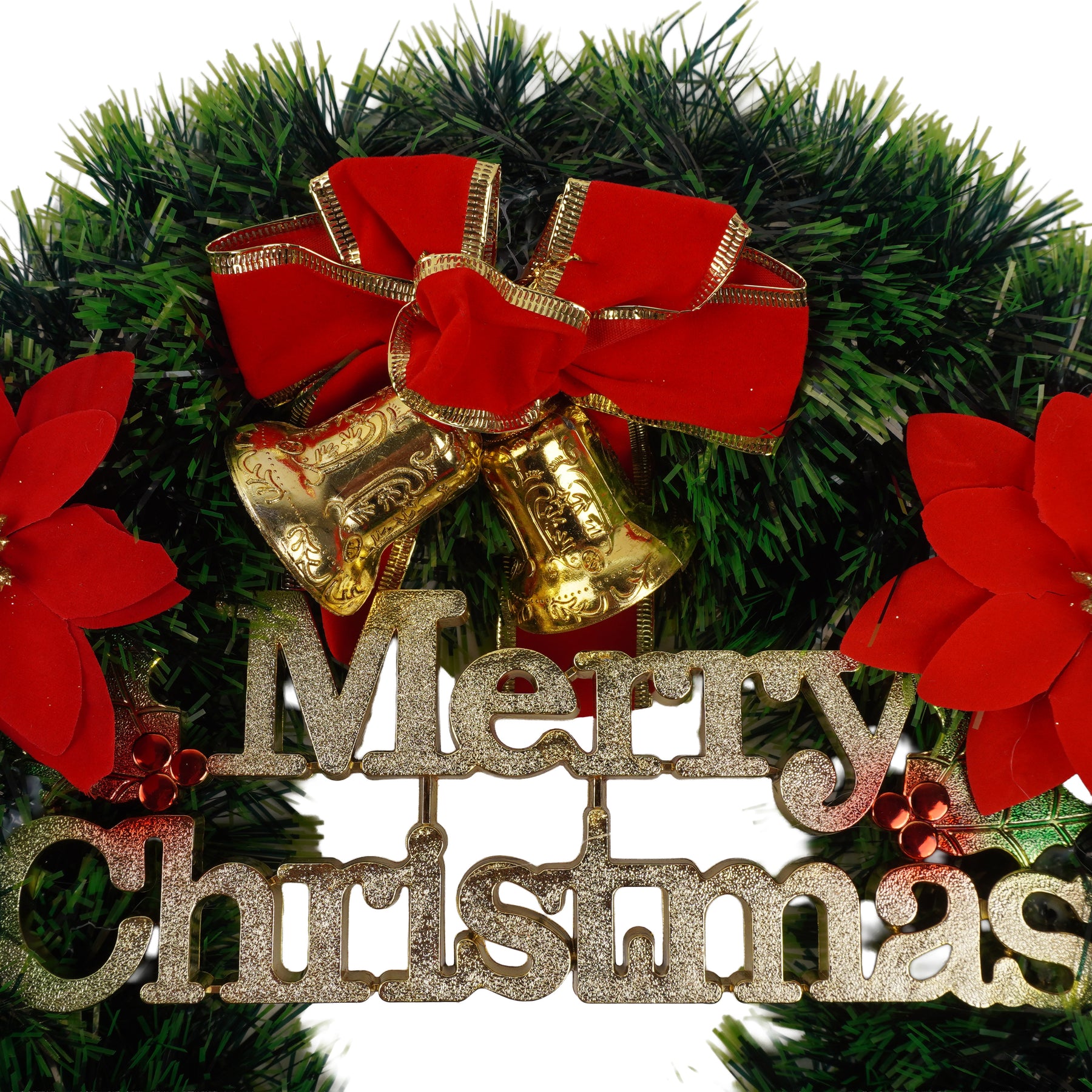 Decorative tinsel wreath with red poinsettias & gold bells
