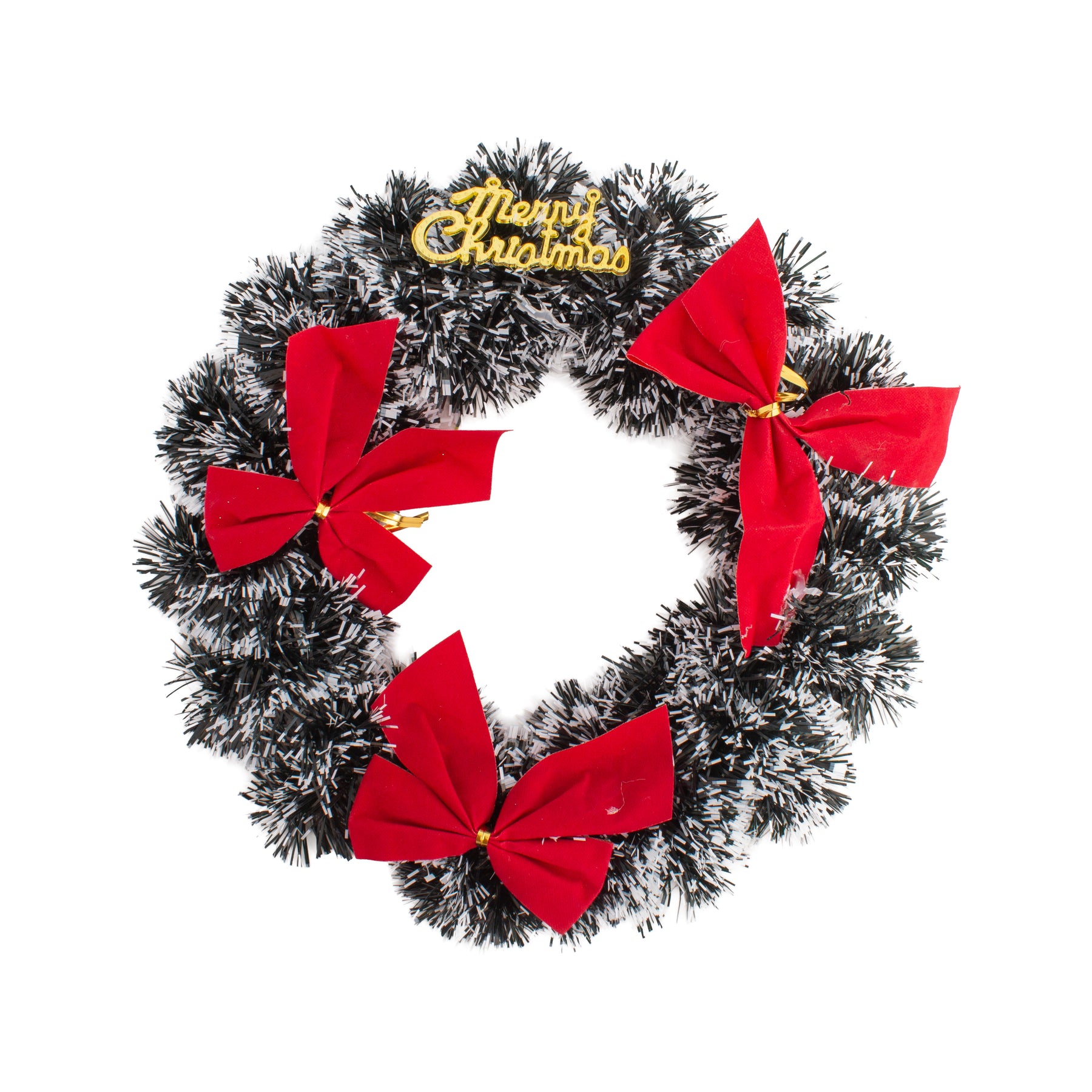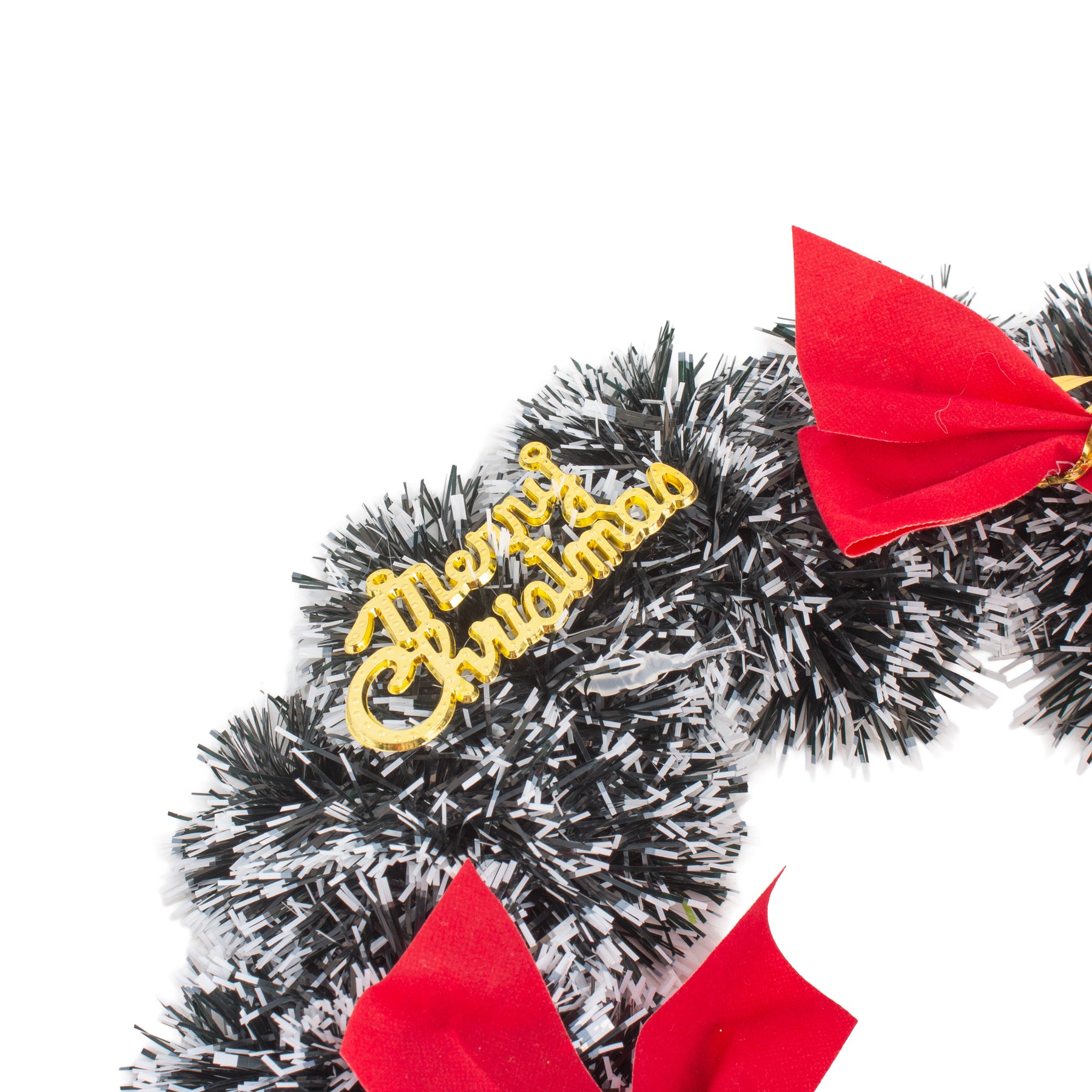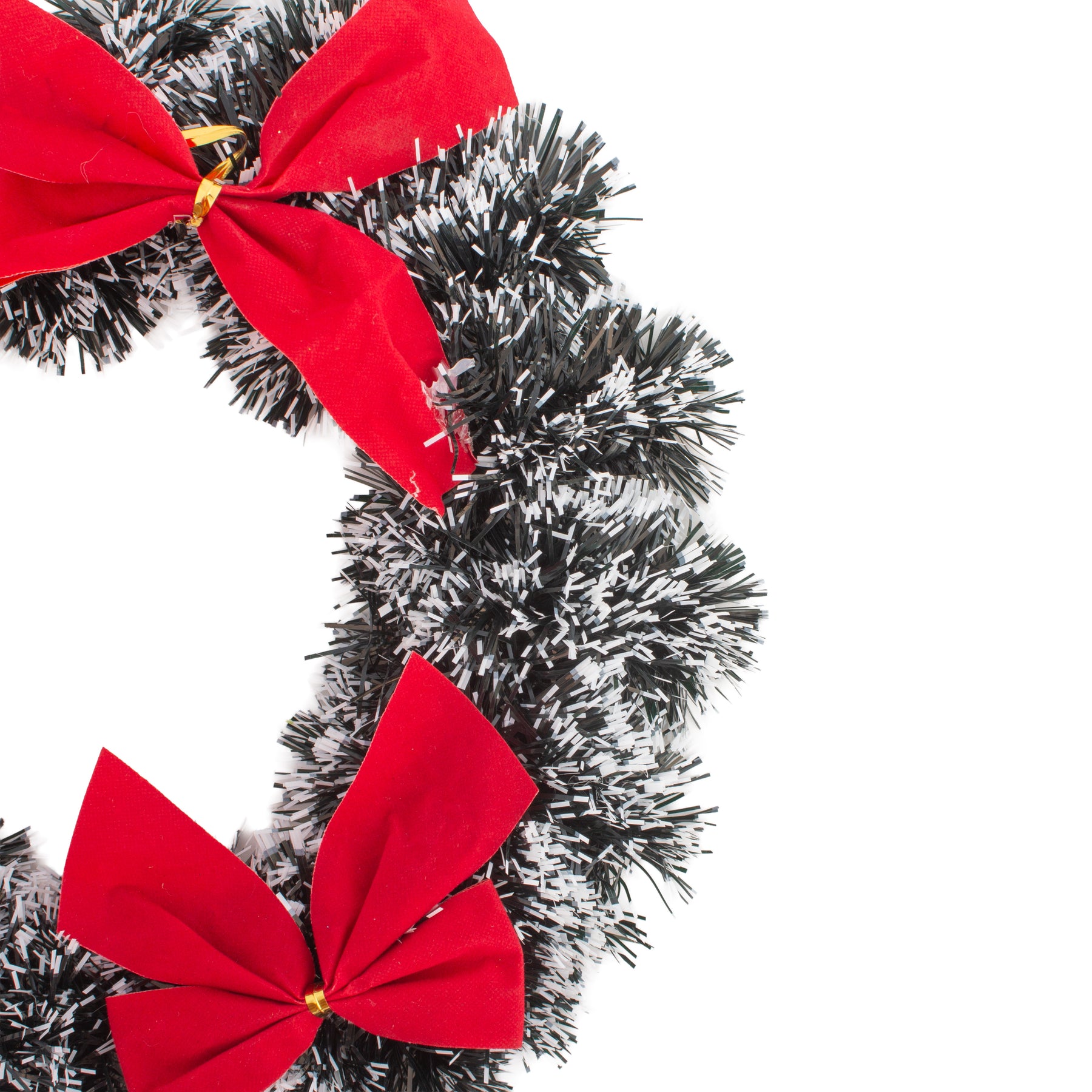 • Snowy green tinsel wreath with a bold red bow accent