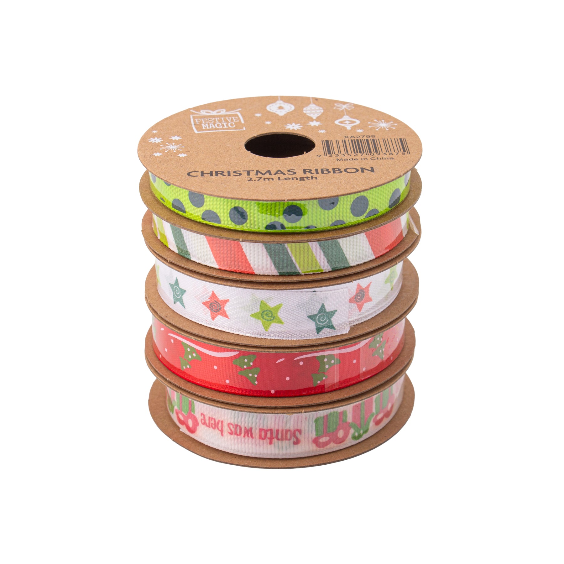 Set of 5 Christmas-Themed Ribbons – 2.7m Each