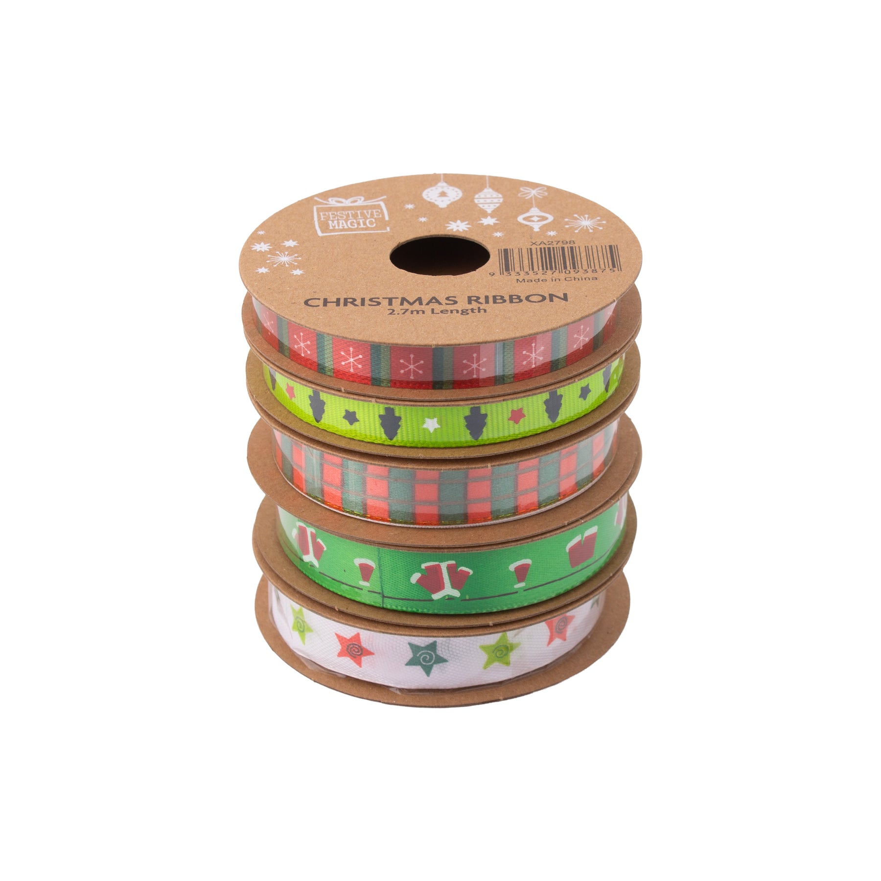 Set of 5 Christmas-Themed Ribbons – 2.7m Each