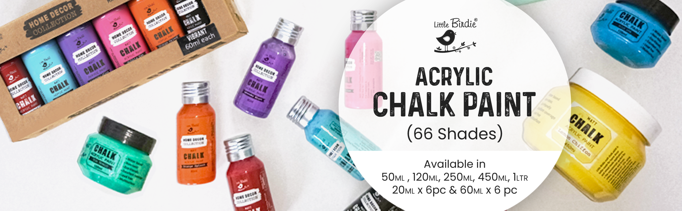 -Little Birdie Chalk paints are available in bottles of 50ml and 120 ml and 6pcs of 60ml kits. The most commonly used shades come in 450ml and also shades like Snow (white) and Charcoal (black) are available in 1 litre jars.