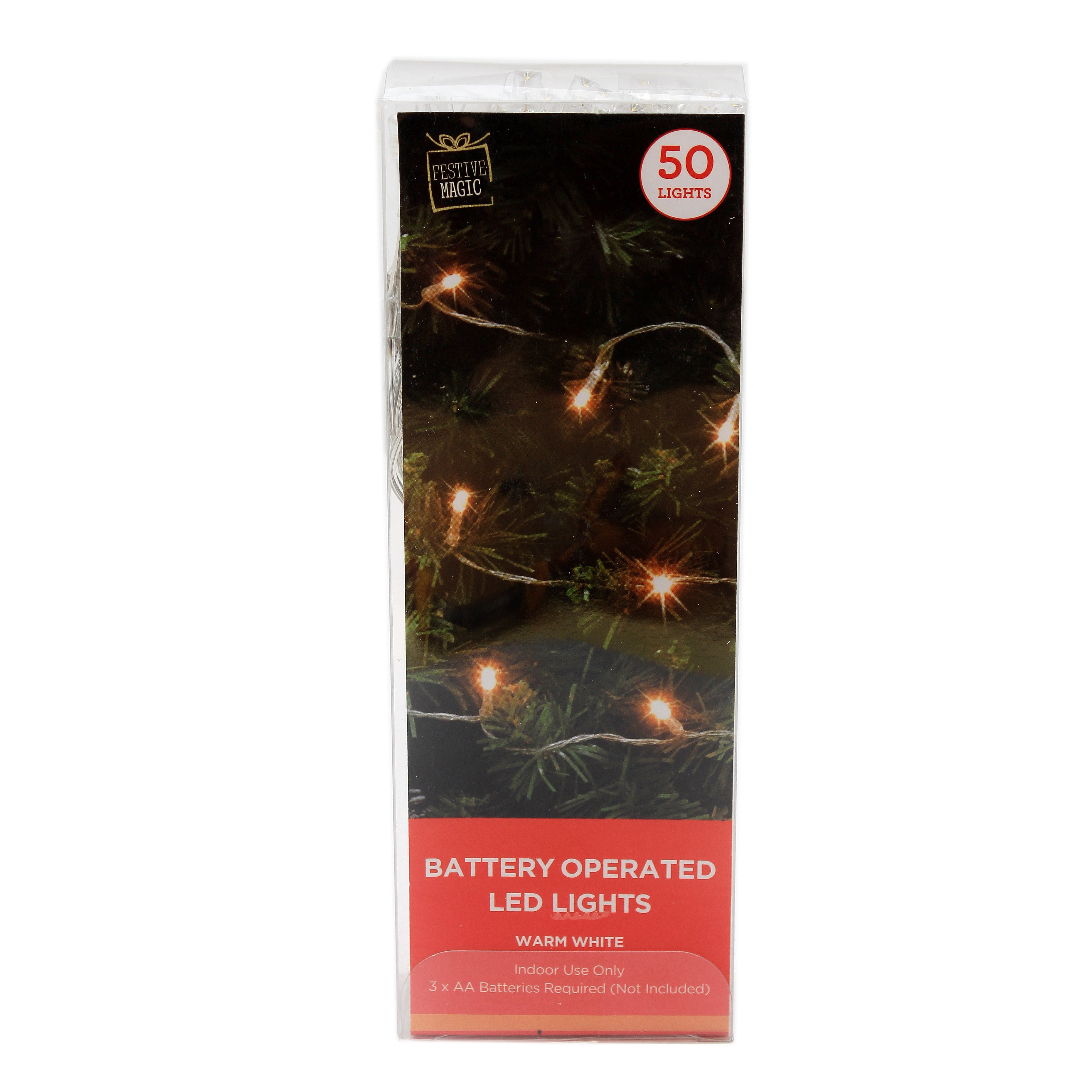 - This pack of battery operated 50 white LED lights is great for festive décor, party décor, and everyday decoration