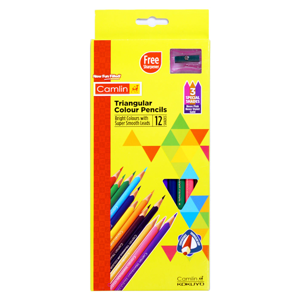 - Camlin Triangular colour pencils in 12 vibrant shades.