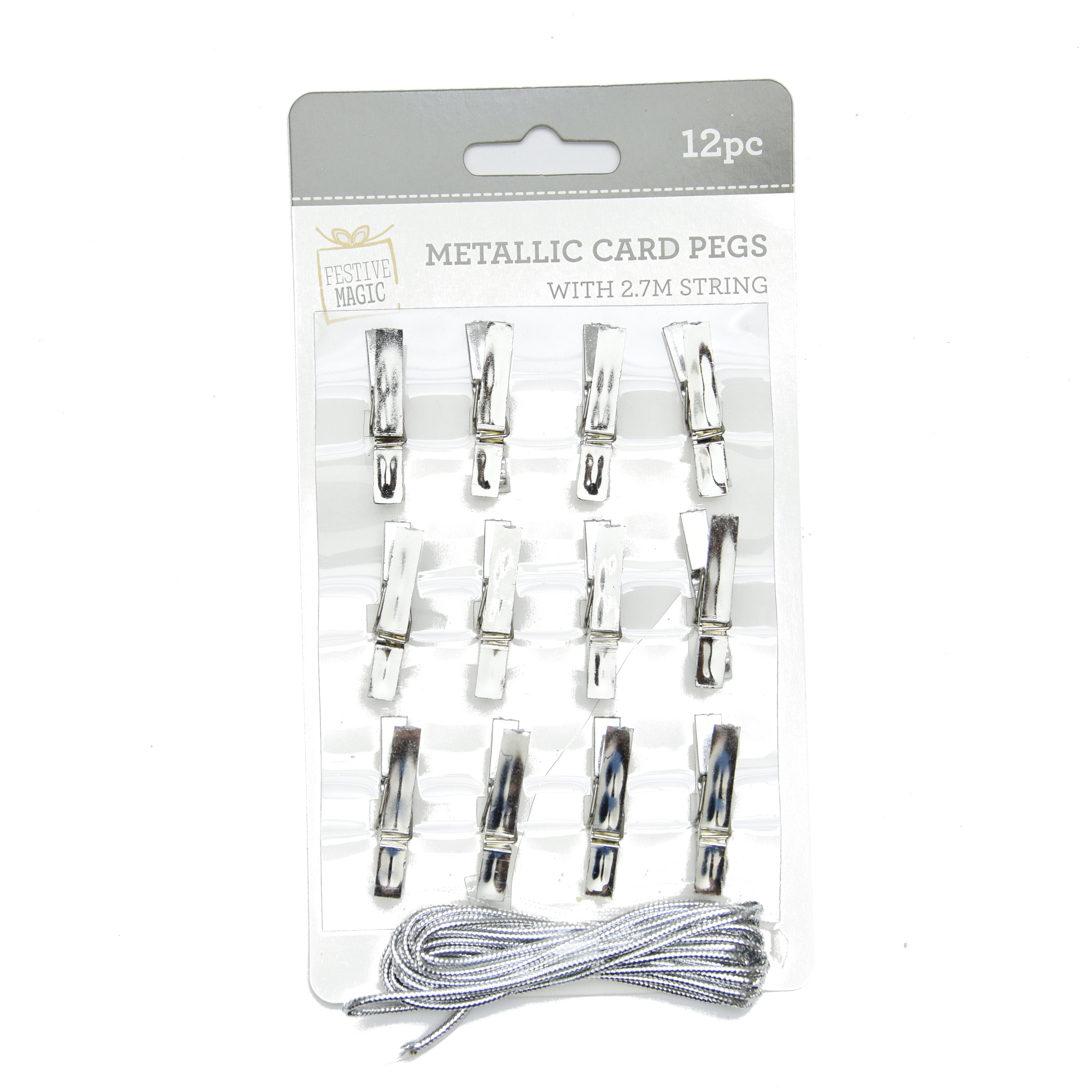 Card Pegs - 12pc, Metallic Silver, 1.5m String