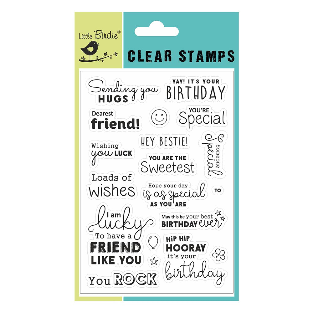 - This is a 4.5" X 6.5" Clear Stamp set containing 19 individual Stamps of Sentiments of Birthday Wishes.