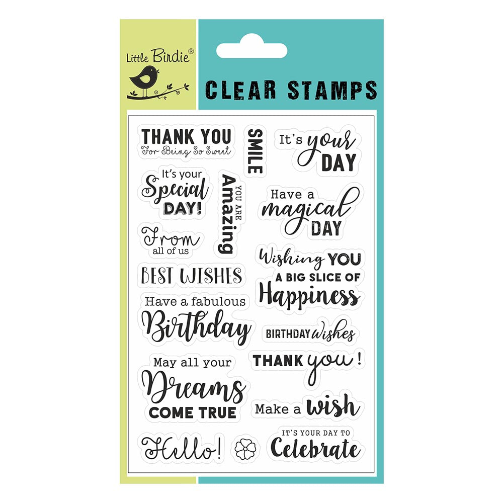 - This is a 4.5" X 6.5" Clear Stamp set containing 17 individual Stamps of Sentiments of Birthday Wishes.
