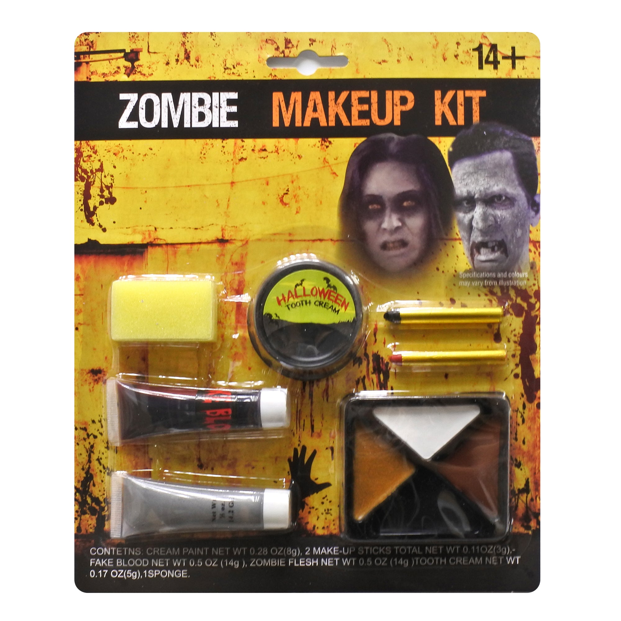 - This make-up kit contains a cream based paint (8g), two make up sticks, fake blood, zombie flesh, tooth cream and a sponge for applying and blending make up