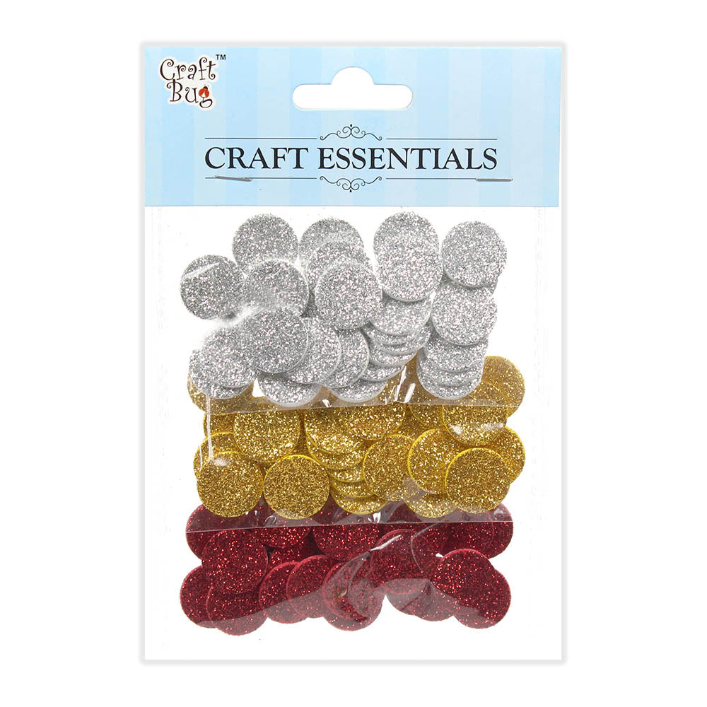 - These glitter Foam Dots about apprx 1.7cm in Diameter and come in 90Pc pack in 3 Colours, each 30 Pieces.