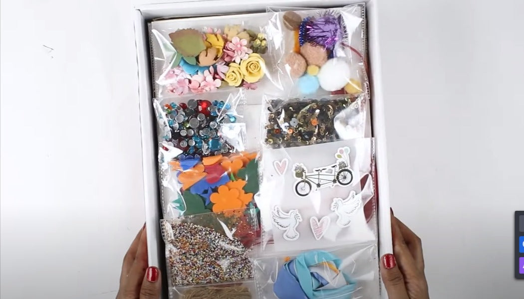 - Contains : Papers, sequins, ribbons, beads, glitter, tags, die cuts, handmade flowers, embellishments and more to jazz up your handmade cards, scrapbook layouts, journal pages, handmade albums, gift tags and other DIY projects.