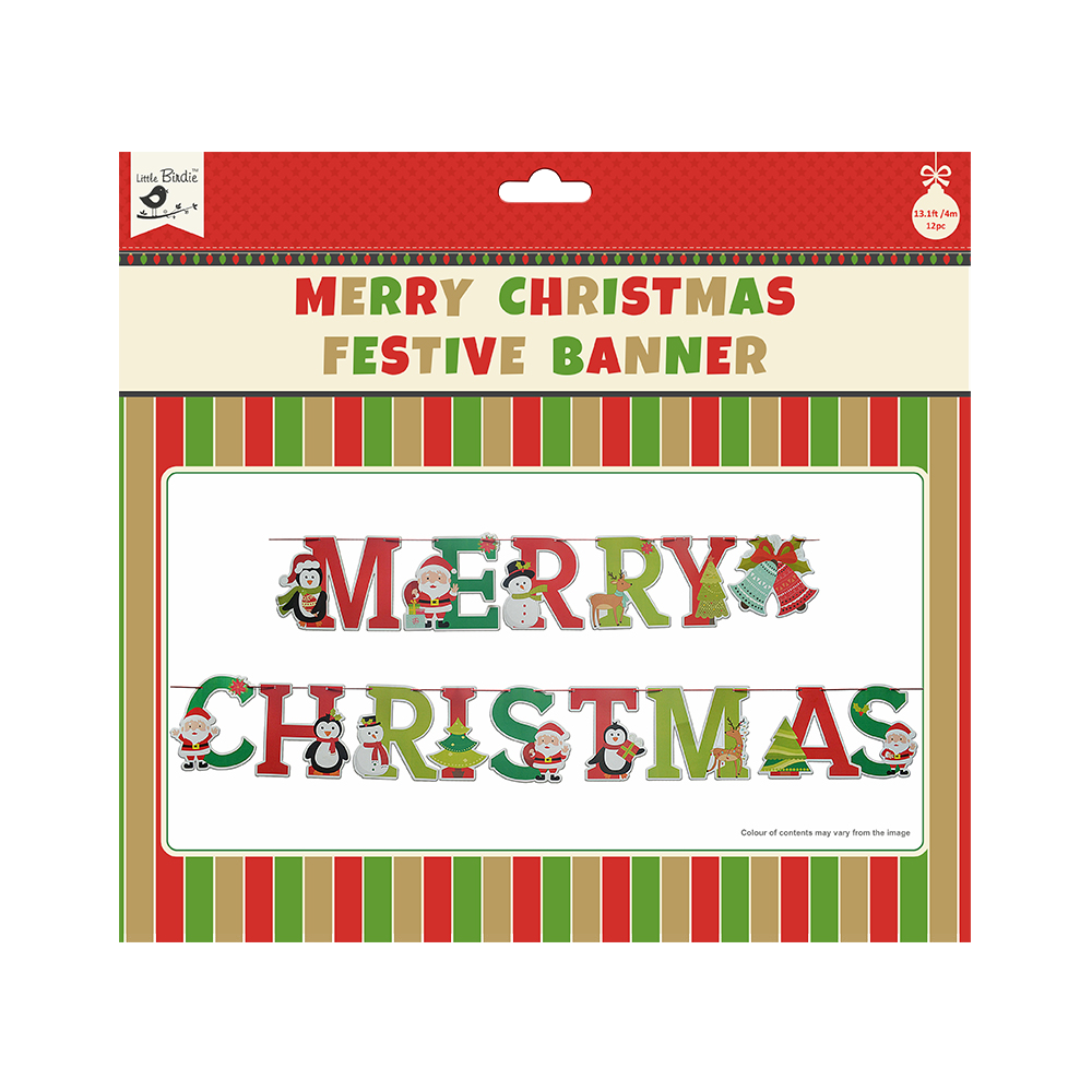 Little Birdie Merry Christmas Festive Banner 15pc & Ribbon 4m