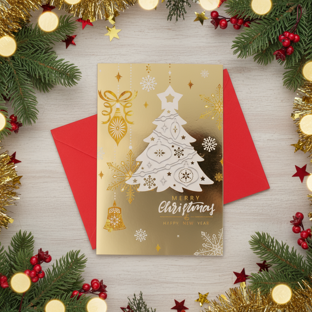 Add a joyful and elegant touch to your holiday greetings with this beautifully designed Christmas card featuring foil detailing. Made with high-quality paper and a smooth finish, it creates a lasting impression for every recipient.