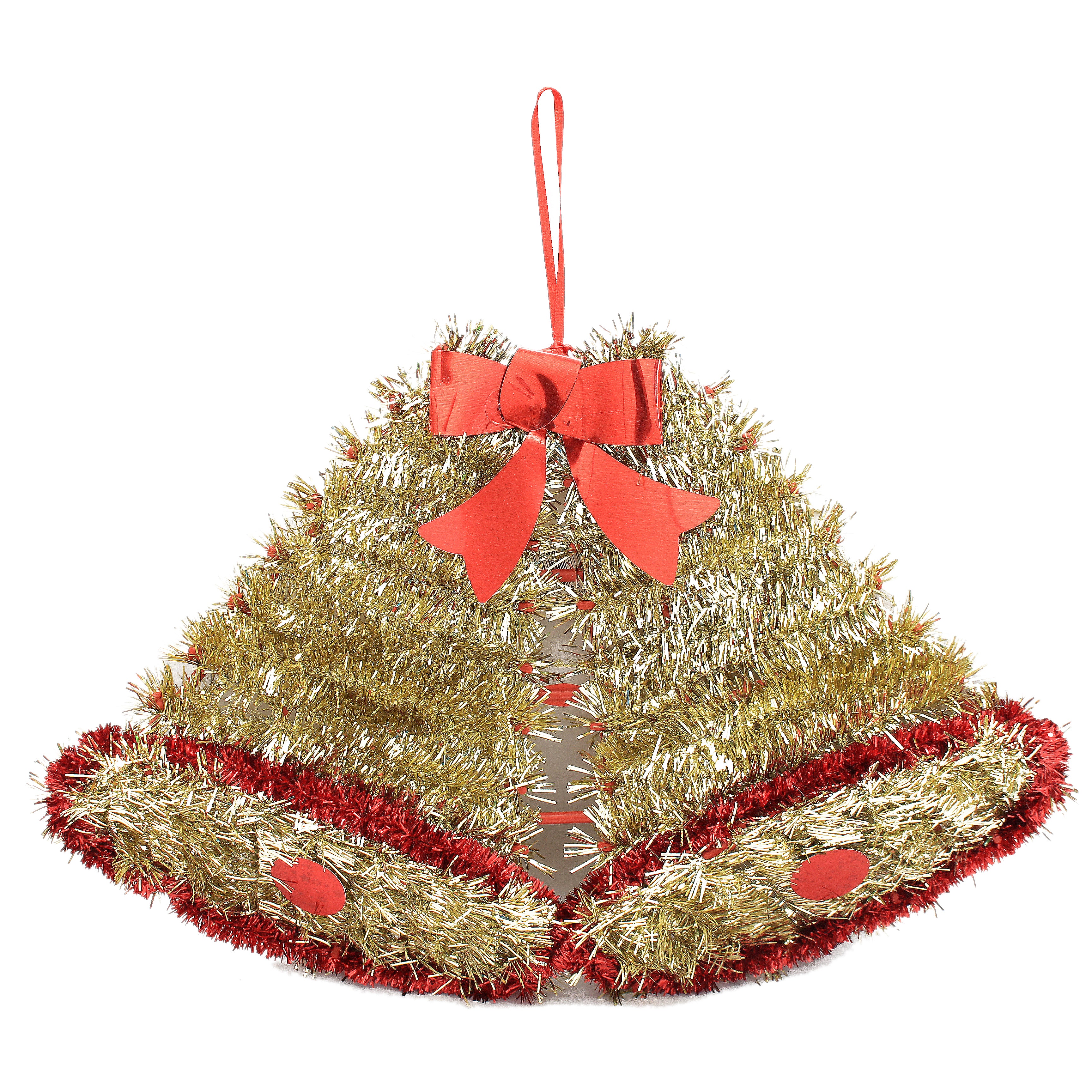 - The one side display, shimmery bell shape cutout adorned with fine cut tinsel is ideal for hanging from a Christmas tree, door, wall or anywhere else