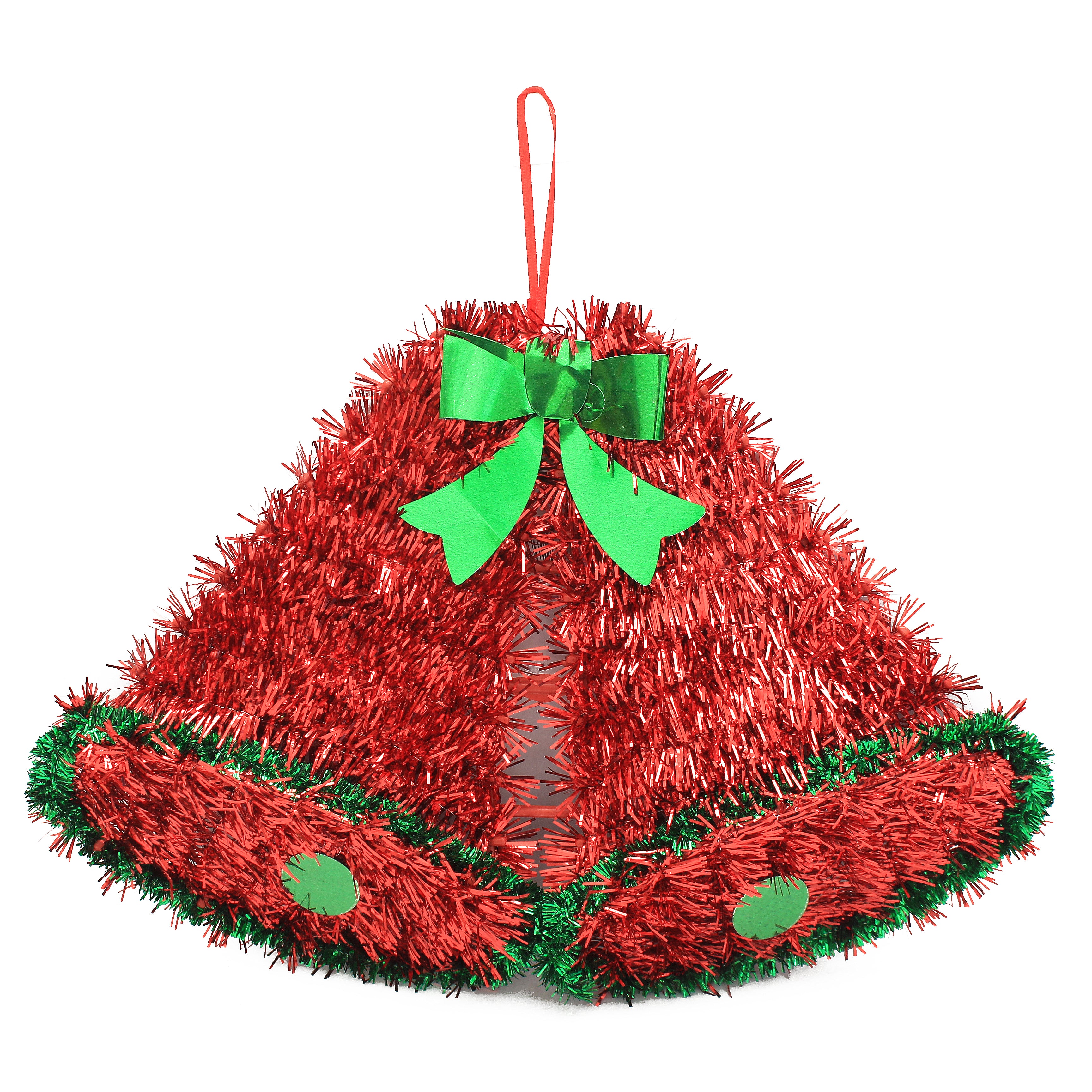 - The one side display, shimmery bell shape cutout adorned with fine cut tinsel is ideal for hanging from a Christmas tree, door, wall or anywhere else
