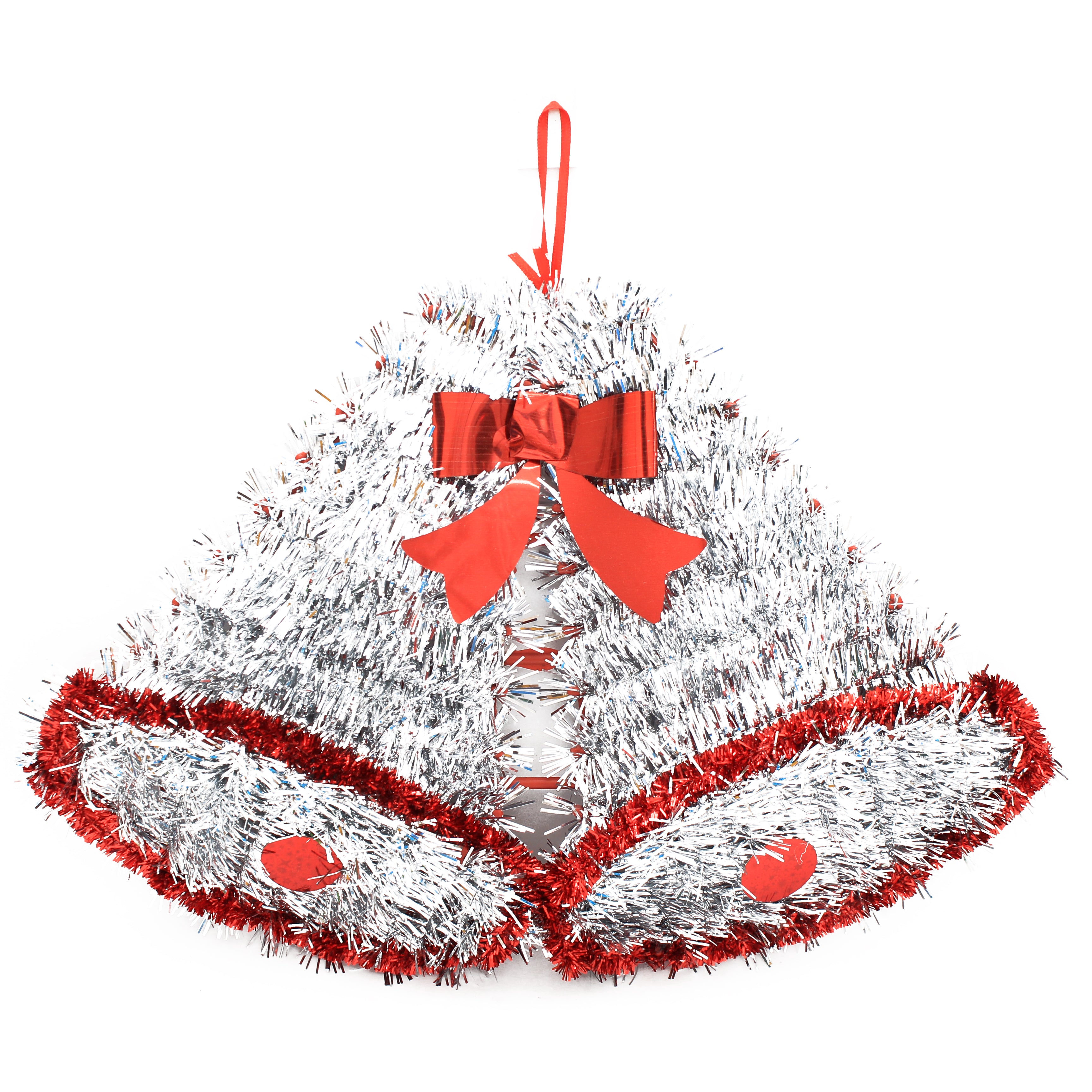 - The one side display, shimmery bell shape cutout adorned with fine cut tinsel is ideal for hanging from a Christmas tree, door, wall or anywhere else