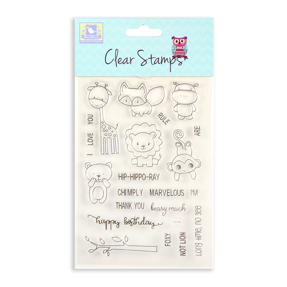 - This is a 4" X 6" Clear Stamp set containing 23 individual stamps of animals and Birthday wishes.