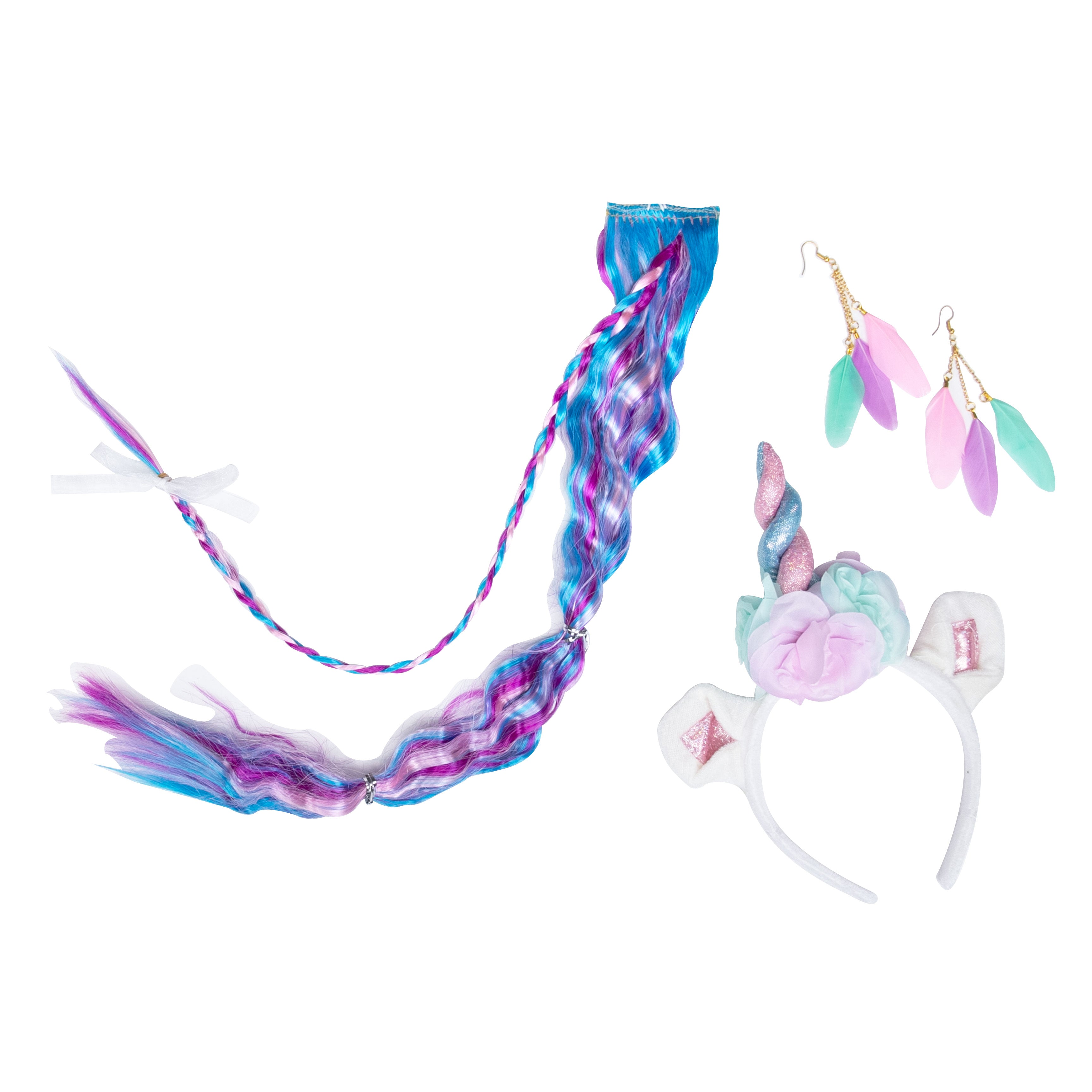 - This unicorn accessory set includes a pair of earrings, a headband and wig braid