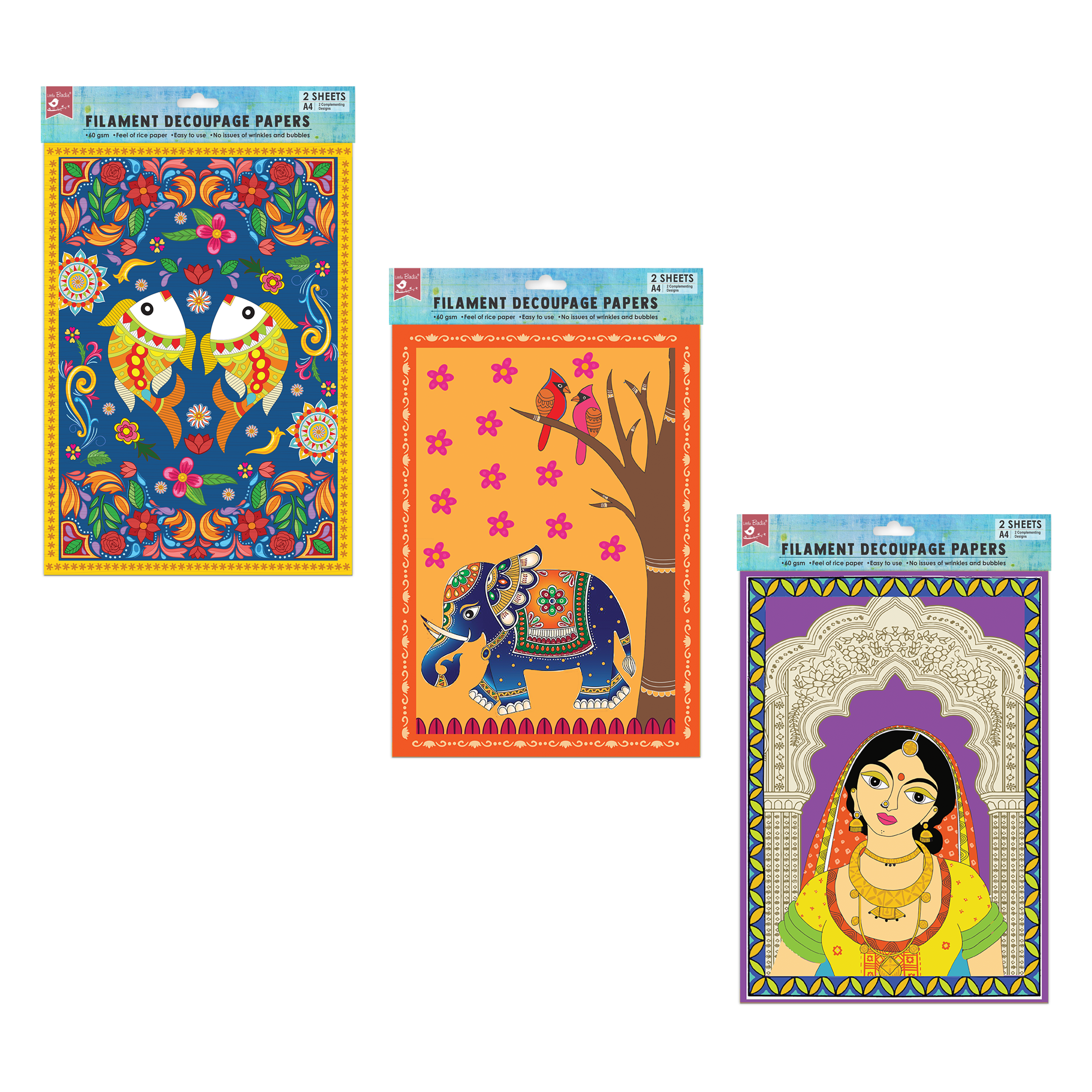 Filament Decoupage Paper Madhubani Fauna 2 Designs, Ethnic Elephant 2 Designs, Vintage Beauty 2 Designs A4 2Sheet