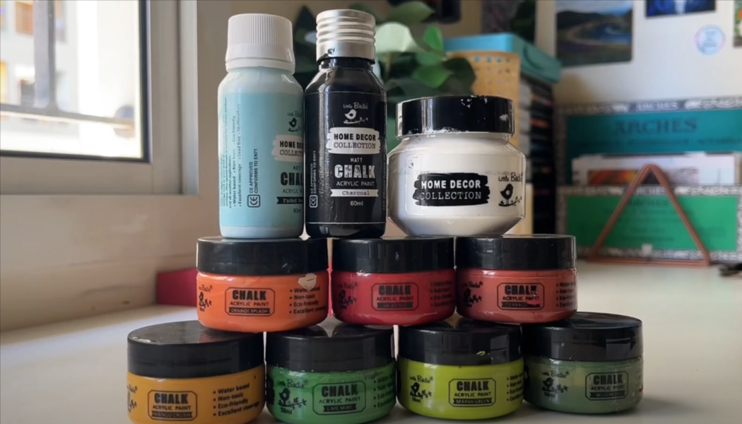 -Little Birdie Chalk paints are available in bottles of 50ml and 120 ml and 6pcs of 60ml kits. The most commonly used shades come in 450ml and also shades like Snow (white) and Charcoal (black) are available in 1 litre jars.