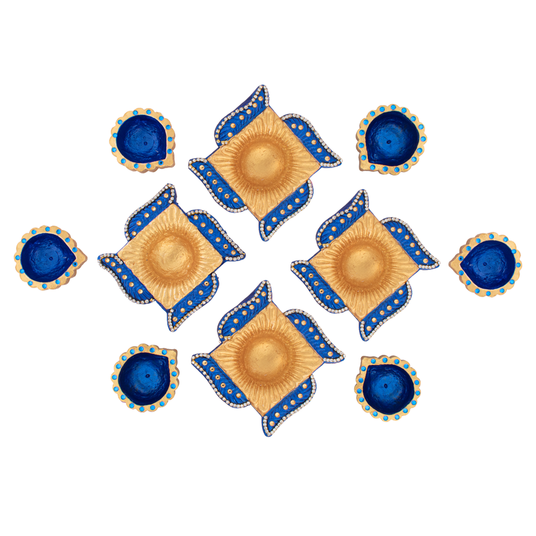 Decorated Terracotta Diya Assorted Shapes Blue 10pc