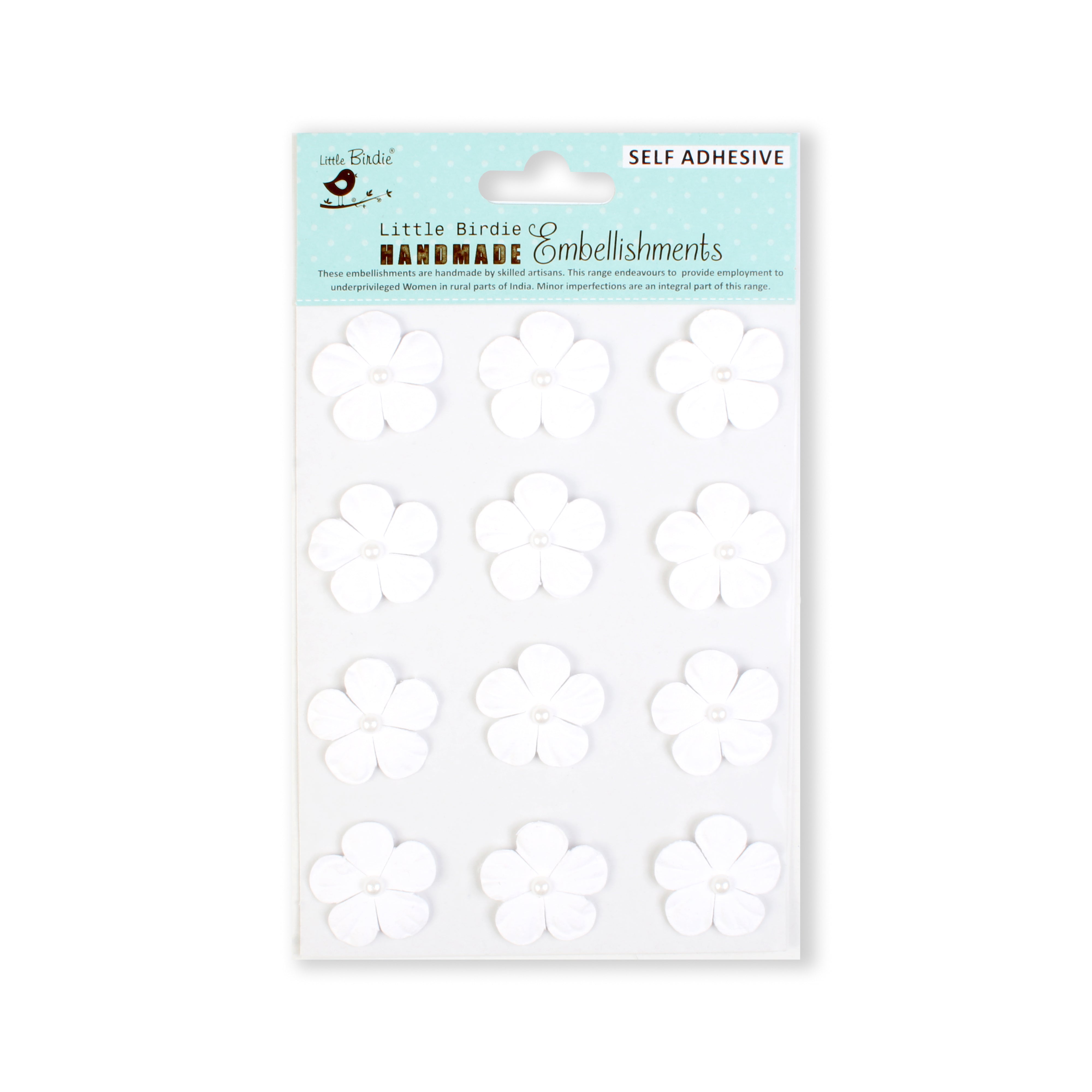 - Adhere these colourful Self-adhesive Printed Pearl Petal Flowers White Embellishments to add elegance to your Cards, Scrapbook layouts, Albums, Photo Frames, Gift boxes and more. Add these with our other coordinating mini embellishments for better visual interest.