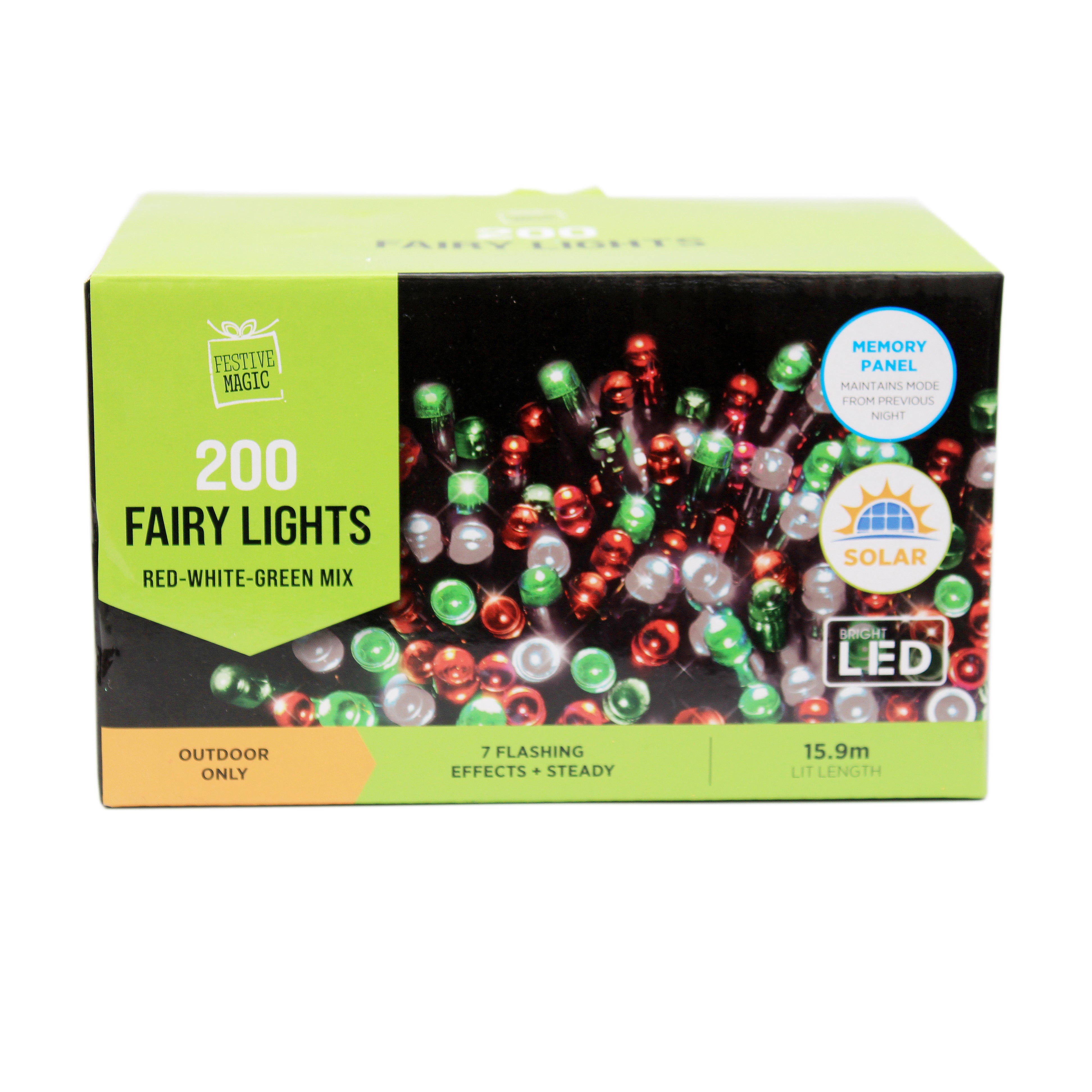 Solar LED Festive Light - Red, White And Green, 200pc, 8 Function Memory, 15.9mt