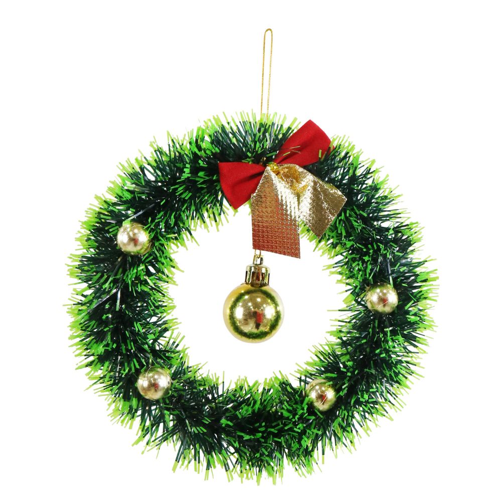 Christmas Tinsel Wreath Dark Green & Green Tip with Bow & Gold Cheery with Bauble 16cm 1pc