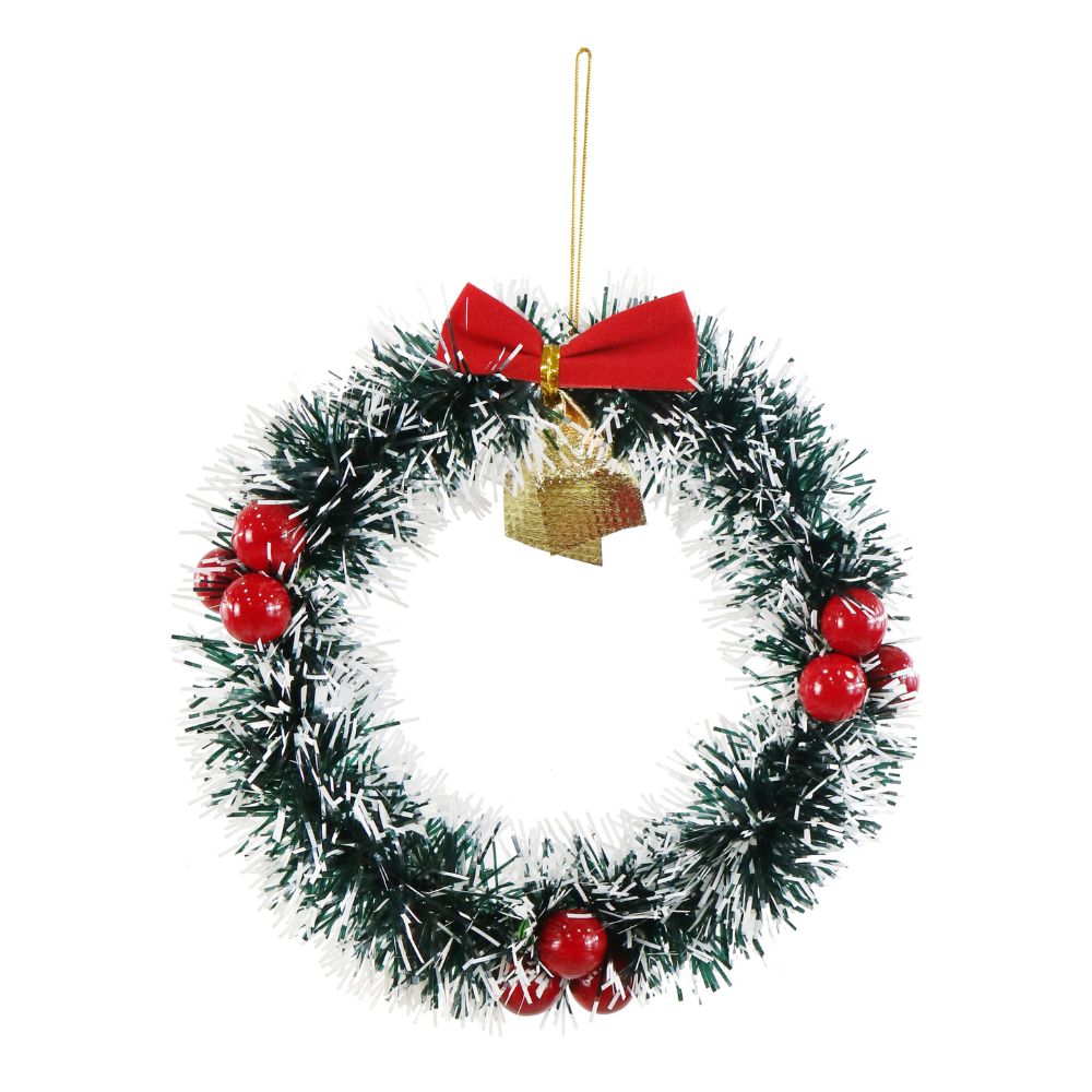 Christmas Tinsel Wreath Dark Green & White Tip with Bow & Red Cherry 16cm 1pc