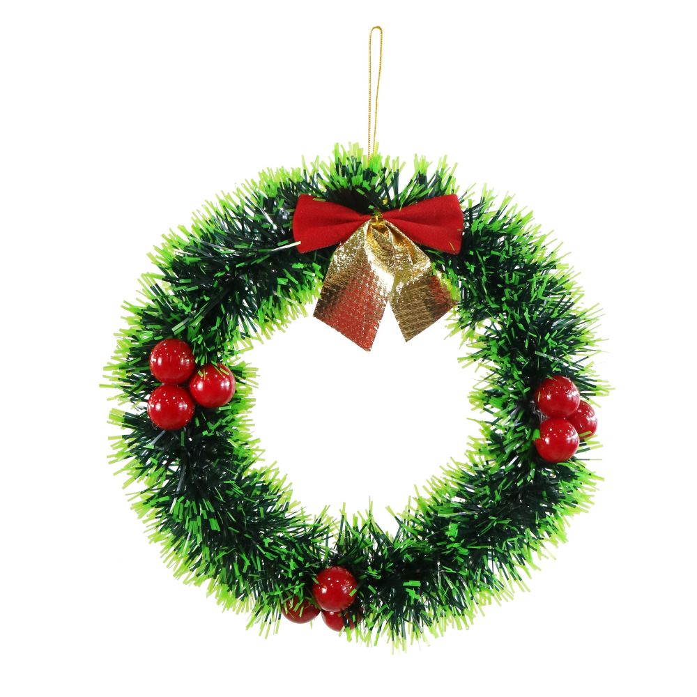 Christmas Tinsel Wreath Dark Green & Green Tip with Bow & Red Cheery 16cm 1pc