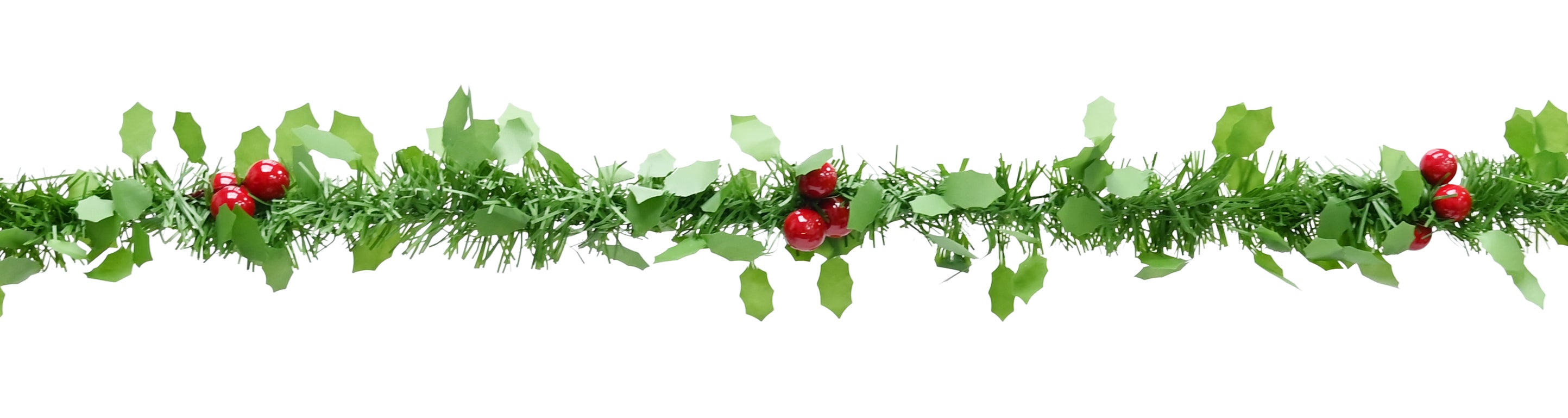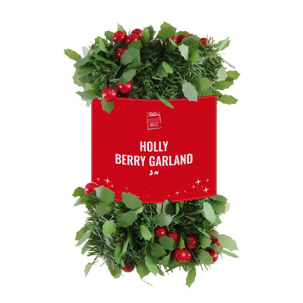 Holly Berry Garland Green Tinsel and Holly Leaves with and 12 Berry Bunches Glossy Red 3mtr