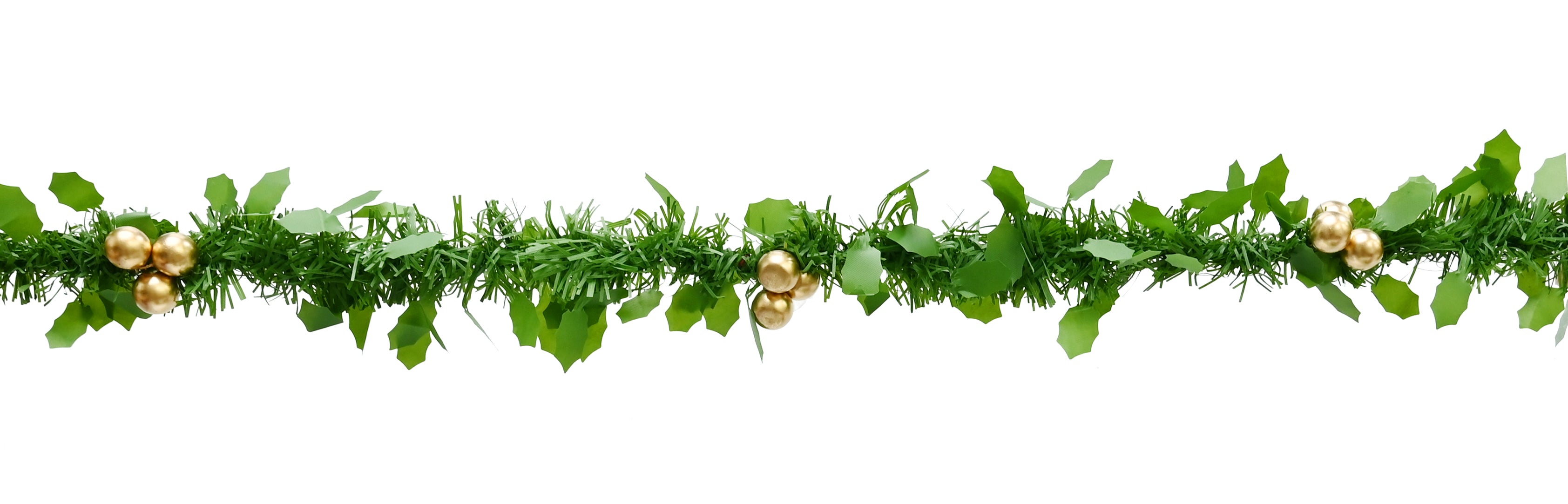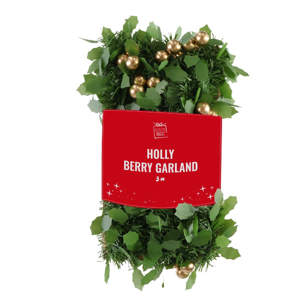 Holly Berry Garland Green Tinsel and Holly Leaves with and 12 Berry Bunches Matte Gold 3mtr