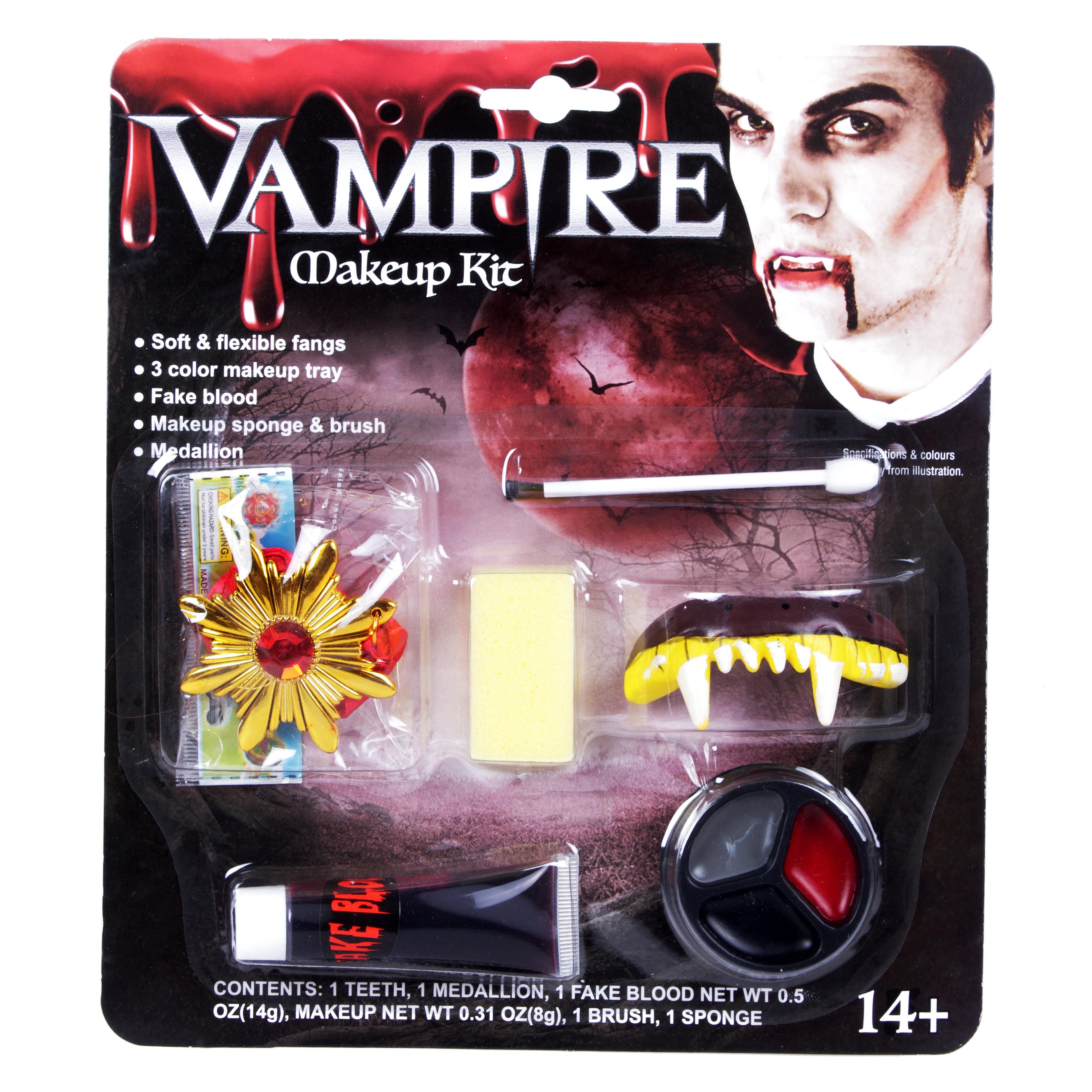 - Contains - 1 Teeth, 1 Medallion, 1 Fake Blood Tube, 1 Brush, 1 Sponge