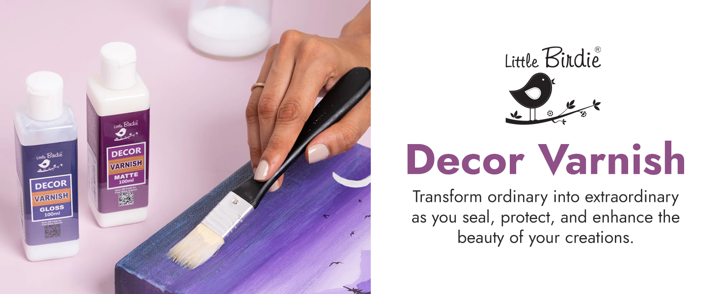 Decor Varnish comes in 2 variants - Glossy and Matte. Glossy gives brightness and shine to your work whereas Matte gives a natural look without a shiny effect.