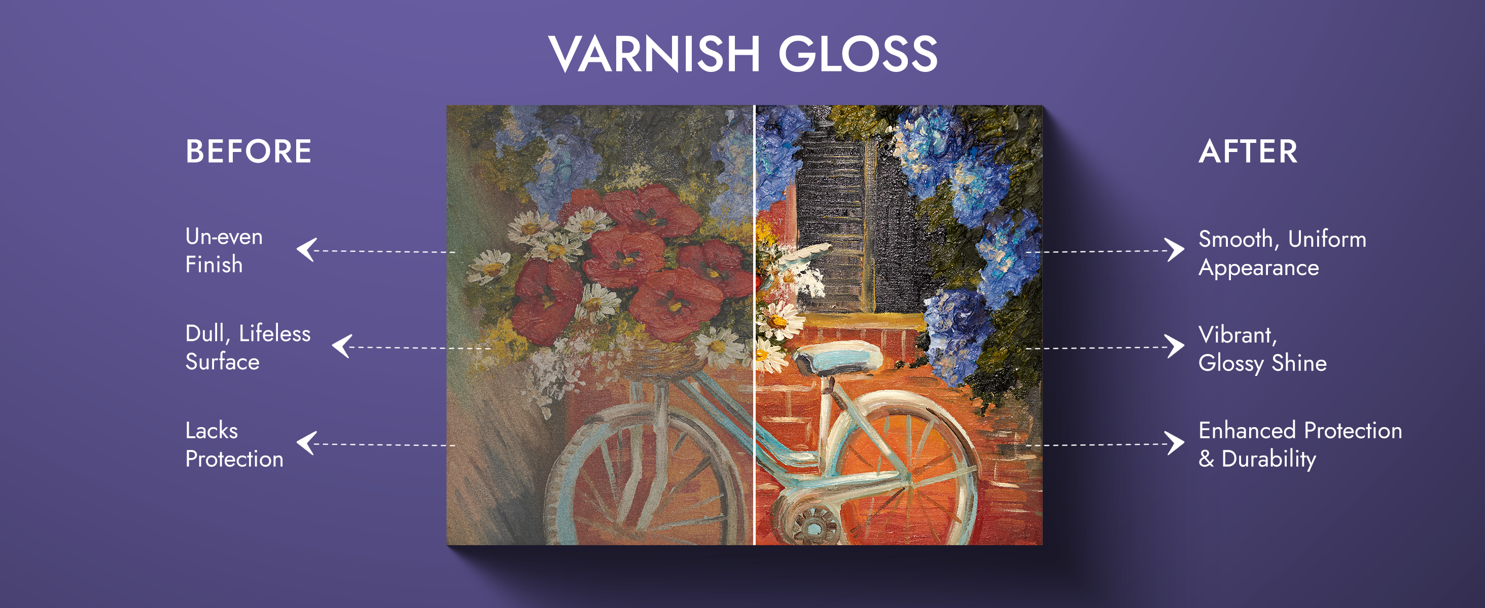 Varnish protects the artwork from dirt and dust and gives an even appearance. It also gives ultimate weather protection and a durable finish to wooden surfaces, MDF, oil and acrylic paintings.