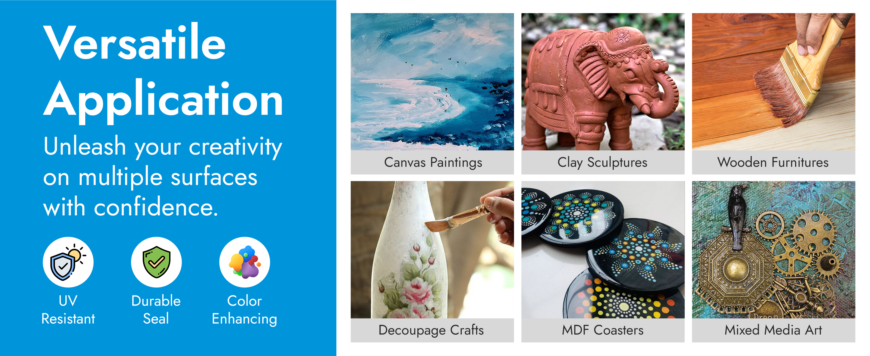 Decor Varnish can be used to seal the work done on all surfaces like wood,glass, metal, terracotta and more. It can be applied on decoupage work, acrylic and oil paintings, painted furniture pieces and also on raw wood.