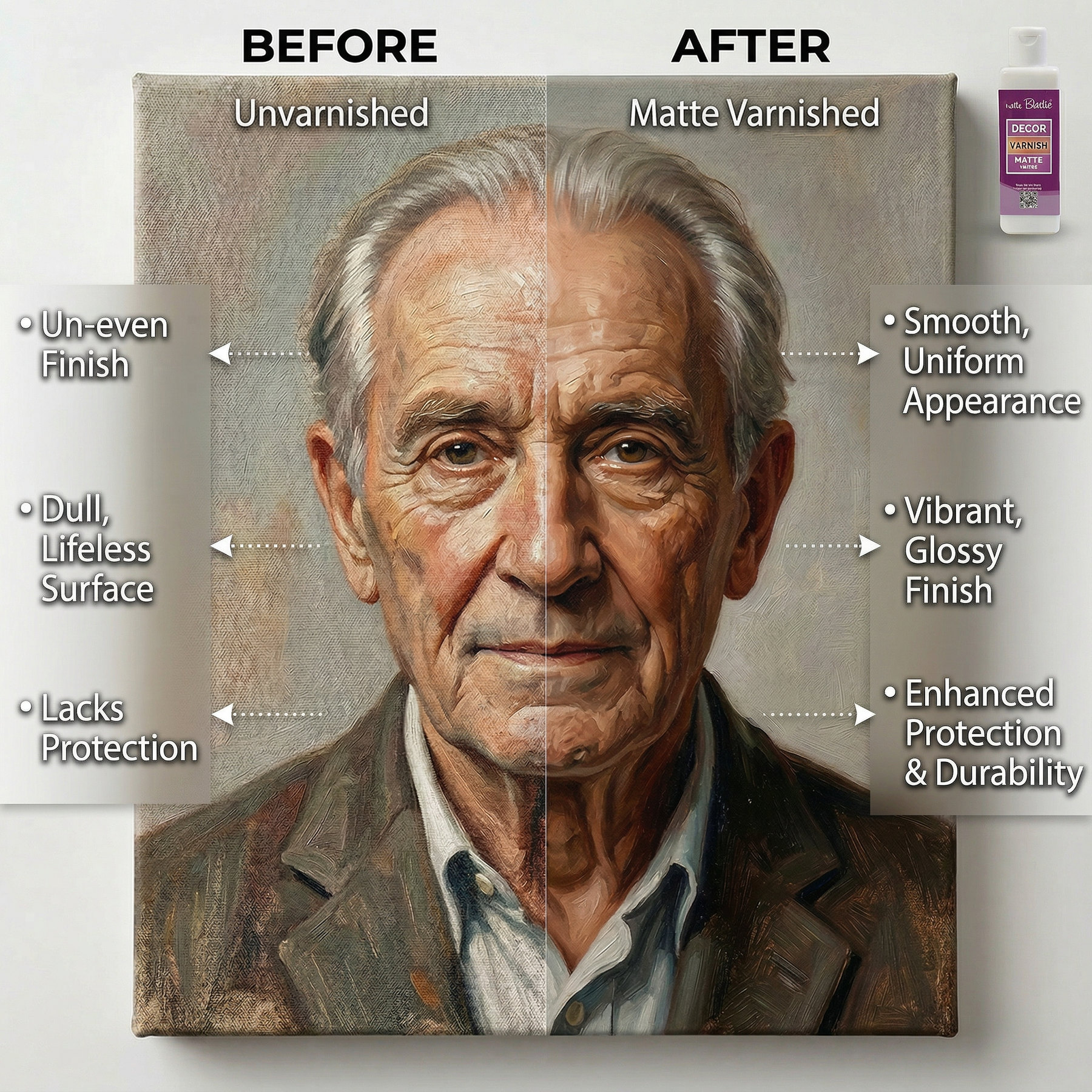 Varnish protects the artwork from dirt and dust and gives an even appearance. It also gives ultimate weather protection and a durable finish to wooden surfaces, MDF, oil and acrylic paintings.