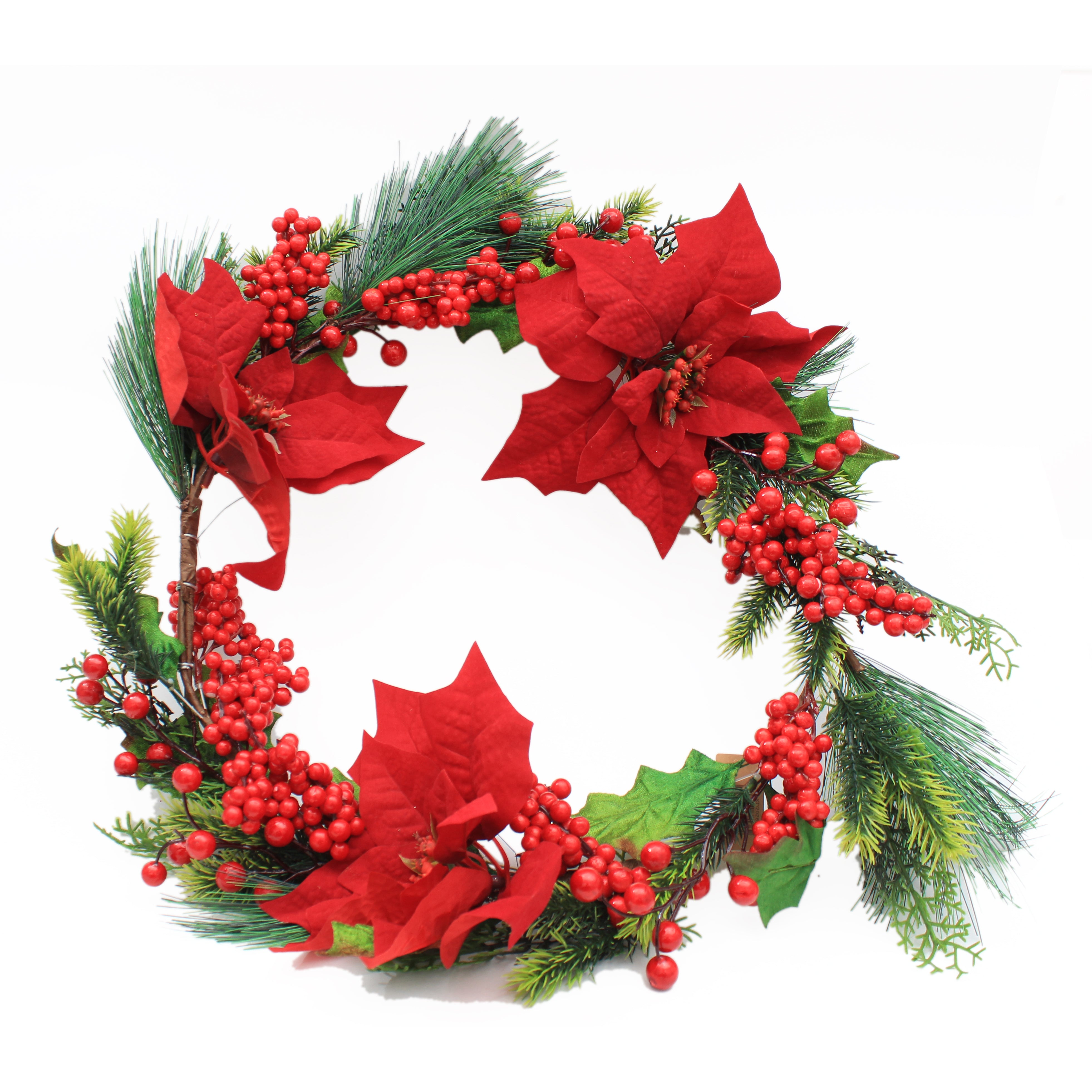 The stunning wreath is designed with the right Christmas elements including velvety poinsettia, glossy holly berries, and faux foliage