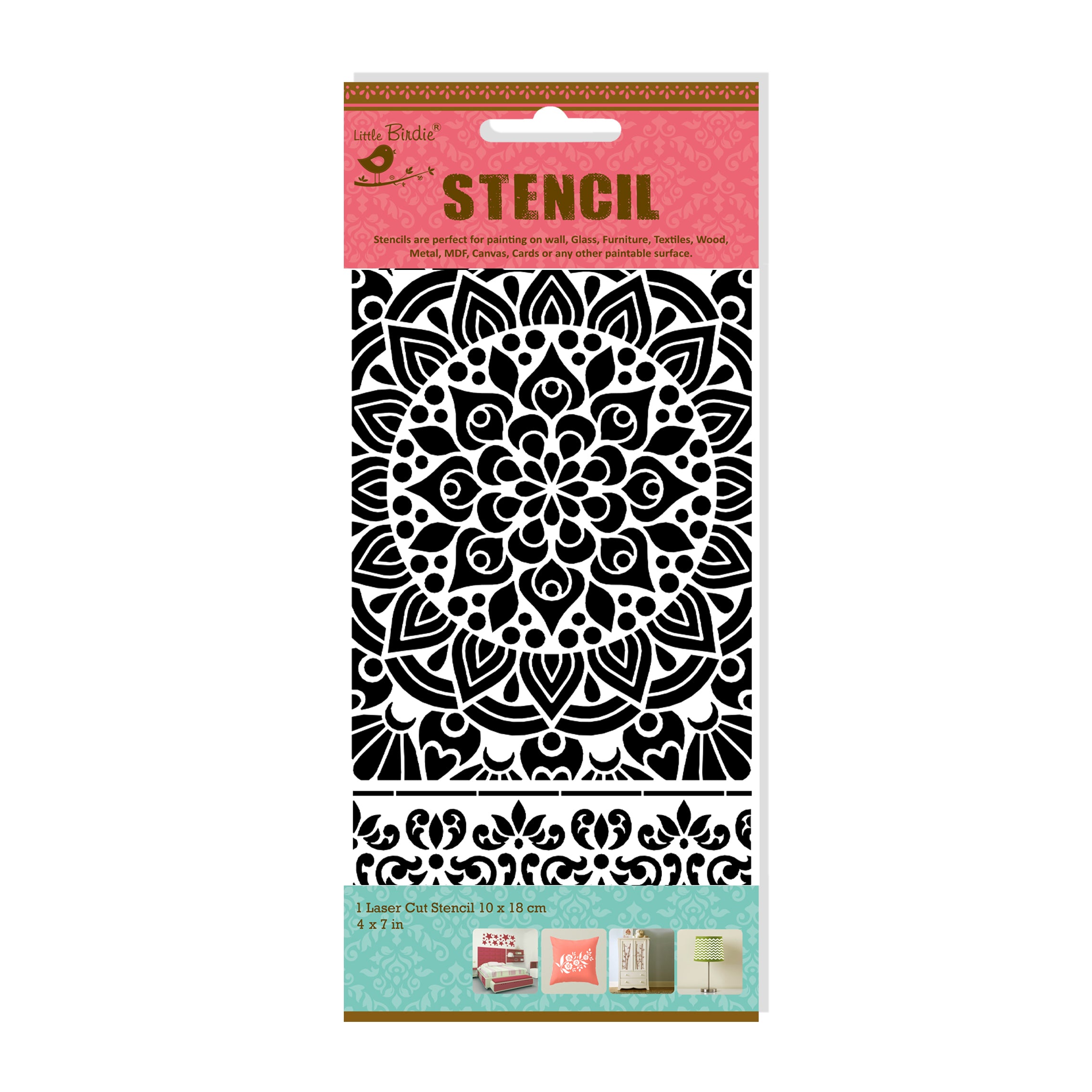 - This stencil has unlimited uses in interior design, craft, artwork. Create customized cushion covers, wall hangings, bags, paintings on glass panes, cupboards and more